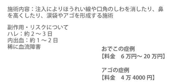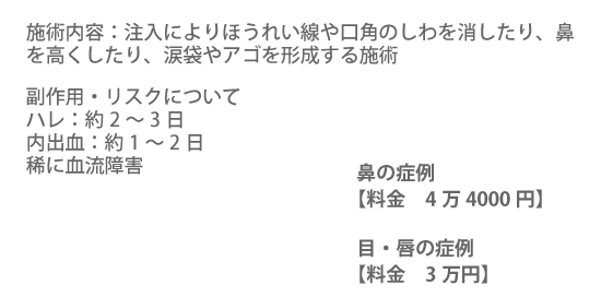 | 副作用・リスク | 腫れ・内出血・左右差・血流障害・アレルギー |