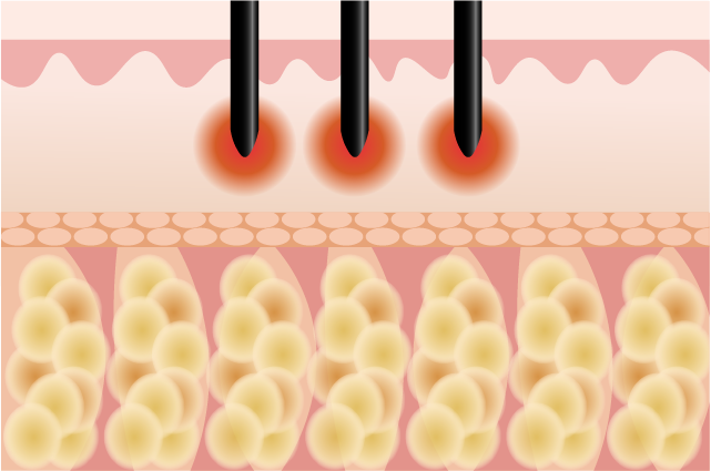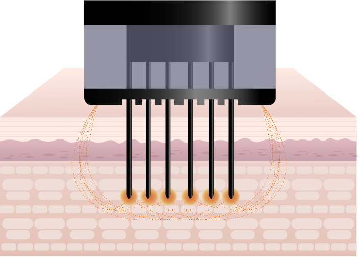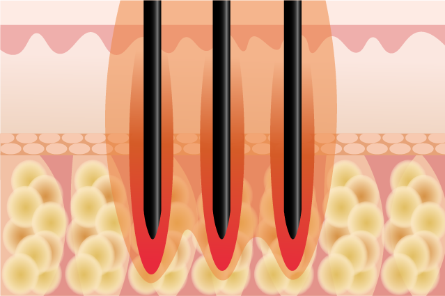 皮膚に針を刺し、その針先からRF熱エネルギーを照射することで、肌の深層にあるコラーゲンを生成する組織を活性化させ、肌のハリ、弾力の回復、たるみの引き締め、ニキビ跡や傷跡の改善、脂肪の減少効果などが期待できます。