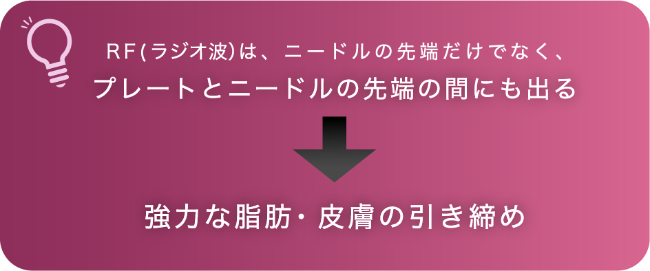 従来のRF治療と異なり、肌を支えるFSN(脂肪を隔てる線維性の隔壁)にまでしっかりとアプローチできるため、皮膚の引き締めだけでなく、不要な脂肪の分解も同時に叶えることが可能です。